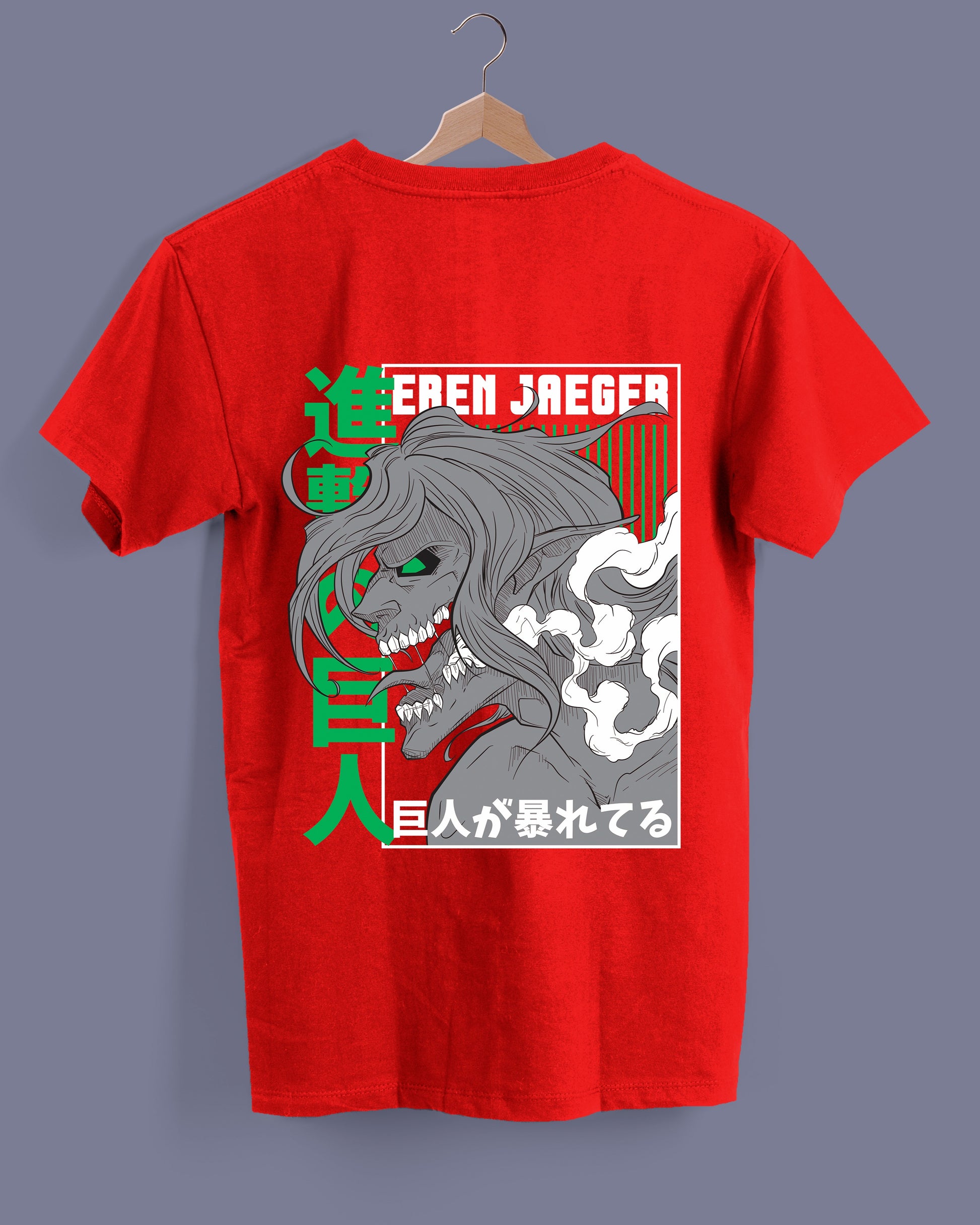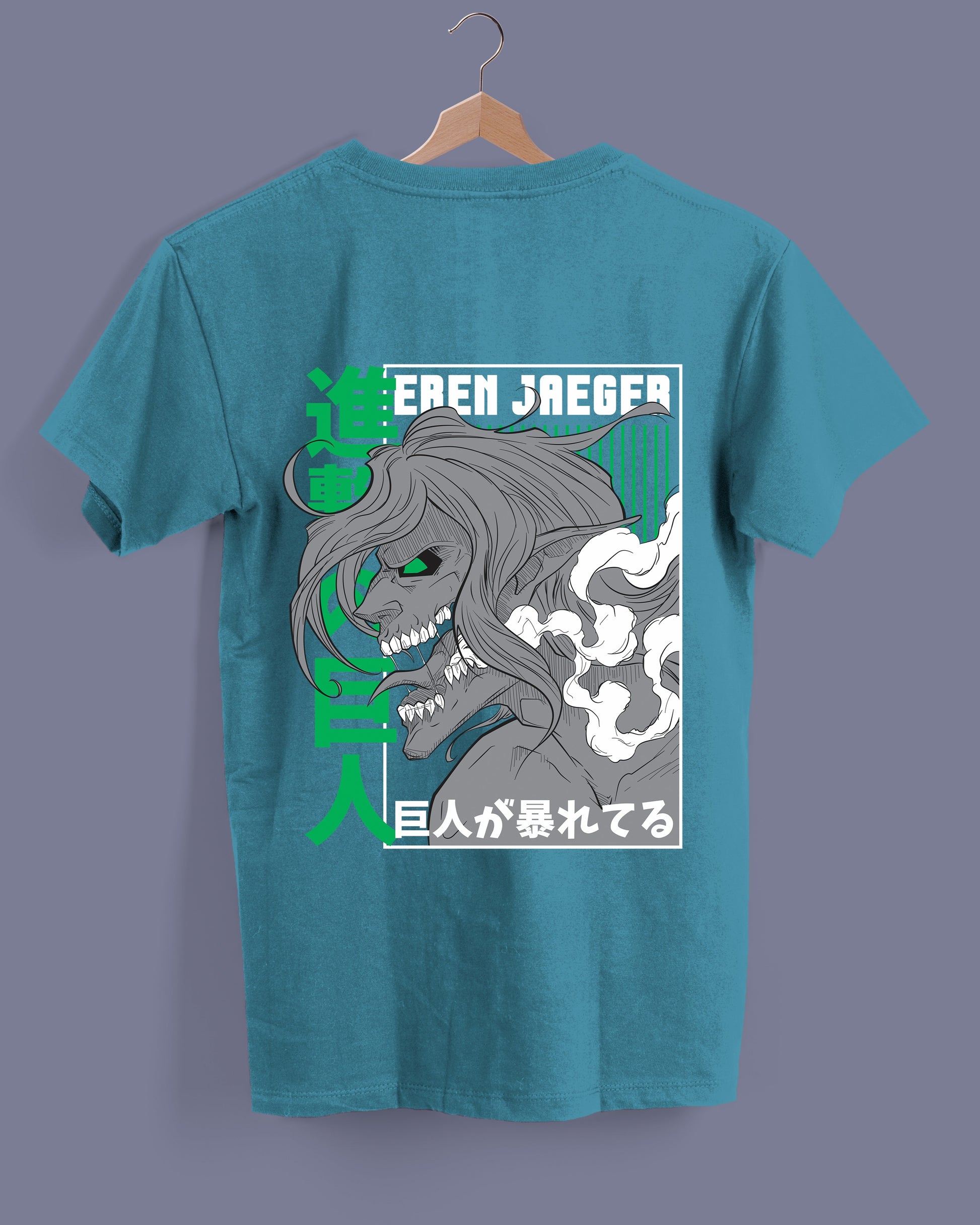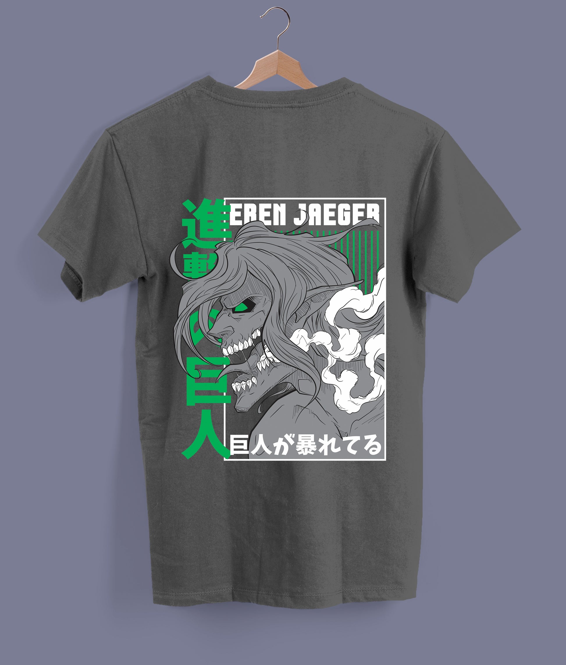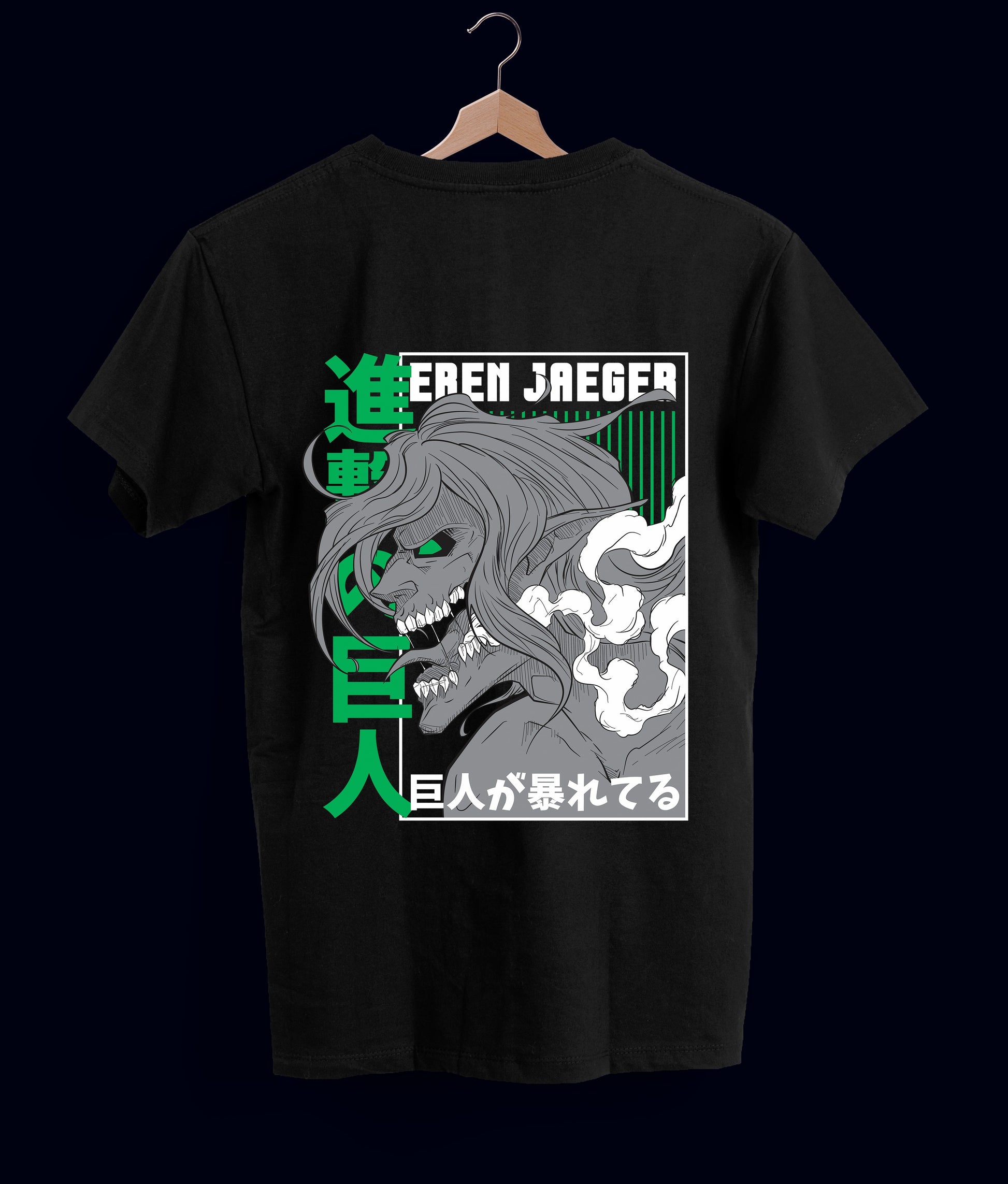 Una explosión visual inspirada en el caos y la furia de Eren Jaeger. Este diseño captura el momento exacto en que la humanidad tiembla y el poder se desata. Trazos intensos, mirada salvaje y energía que rompe la tela.
