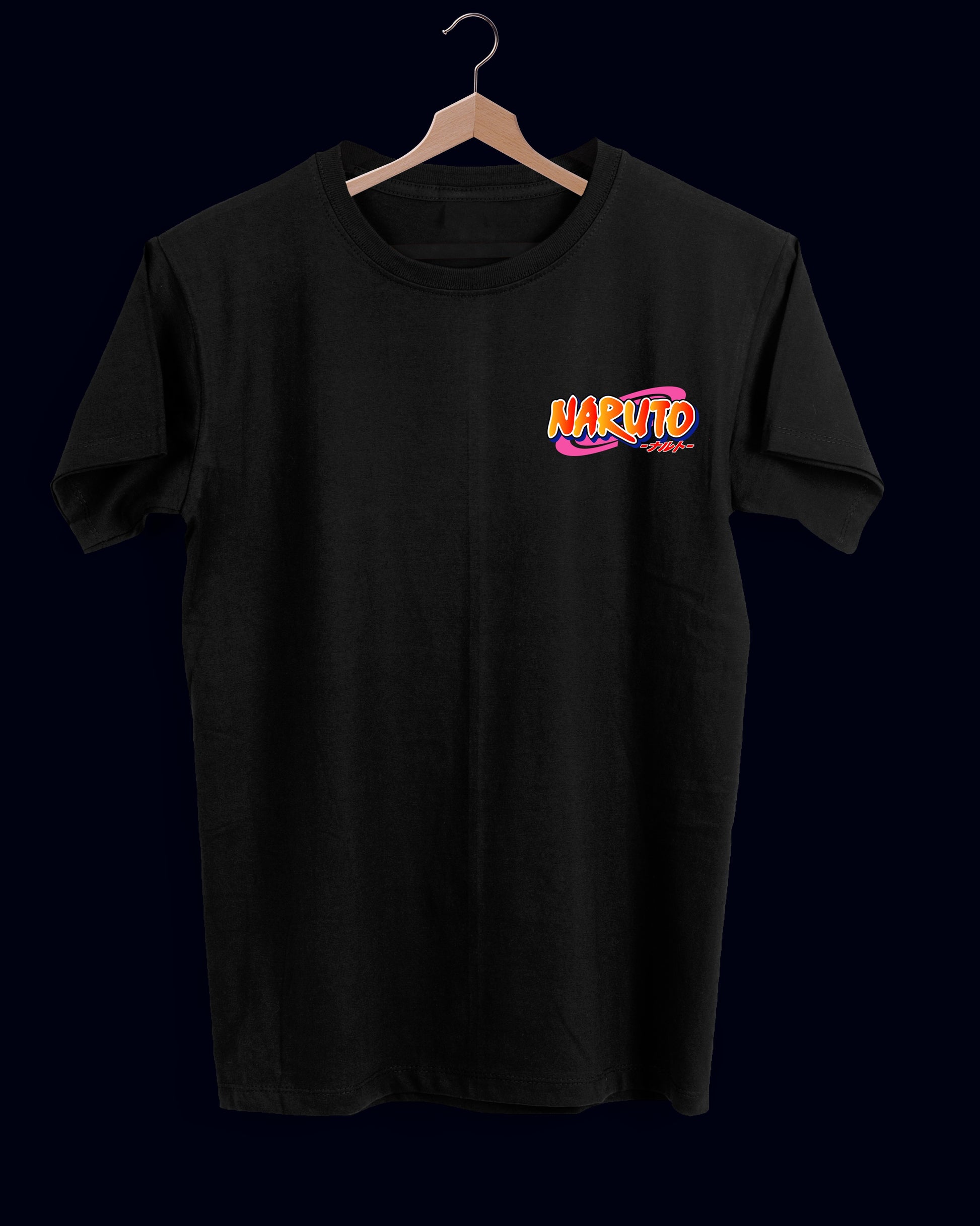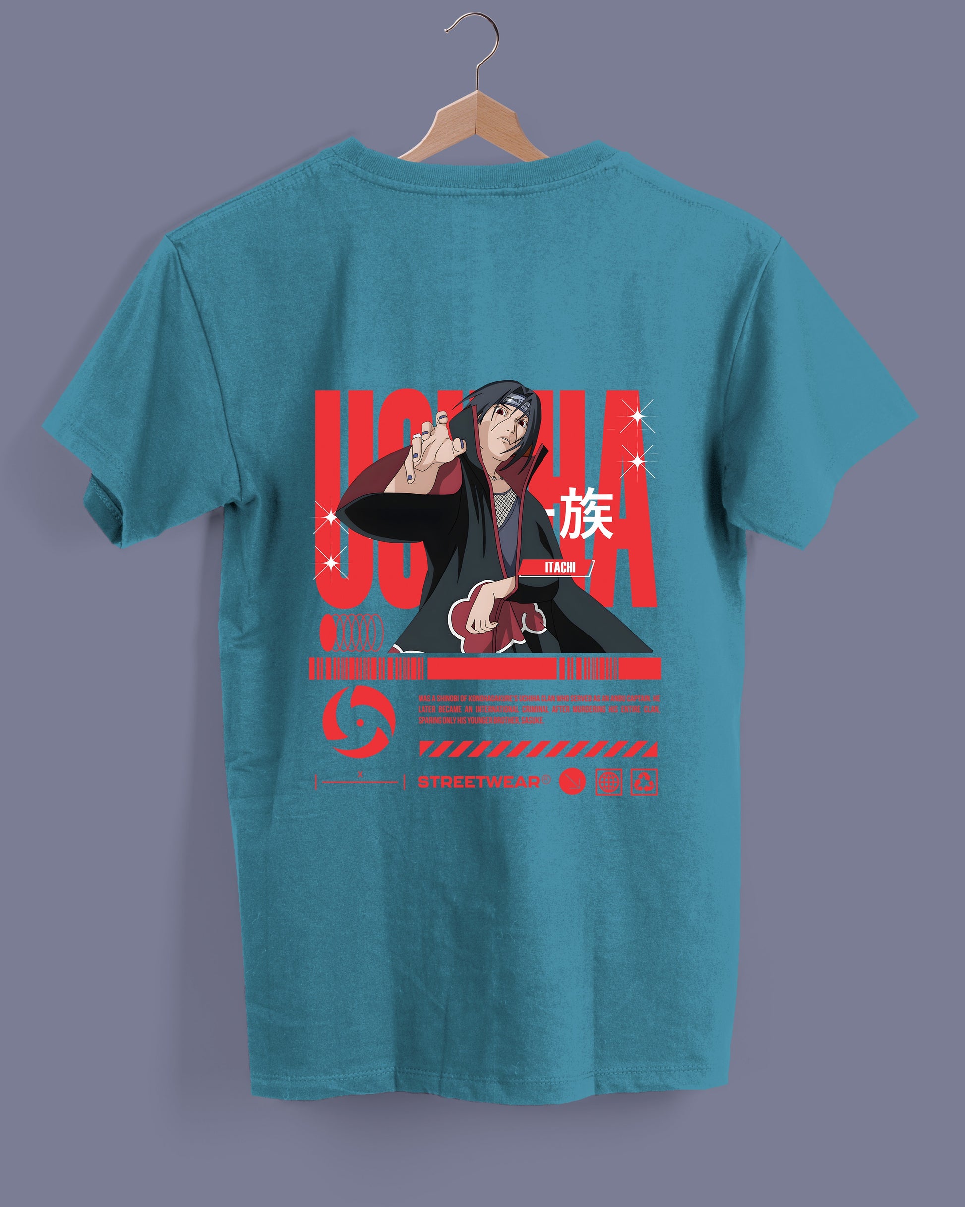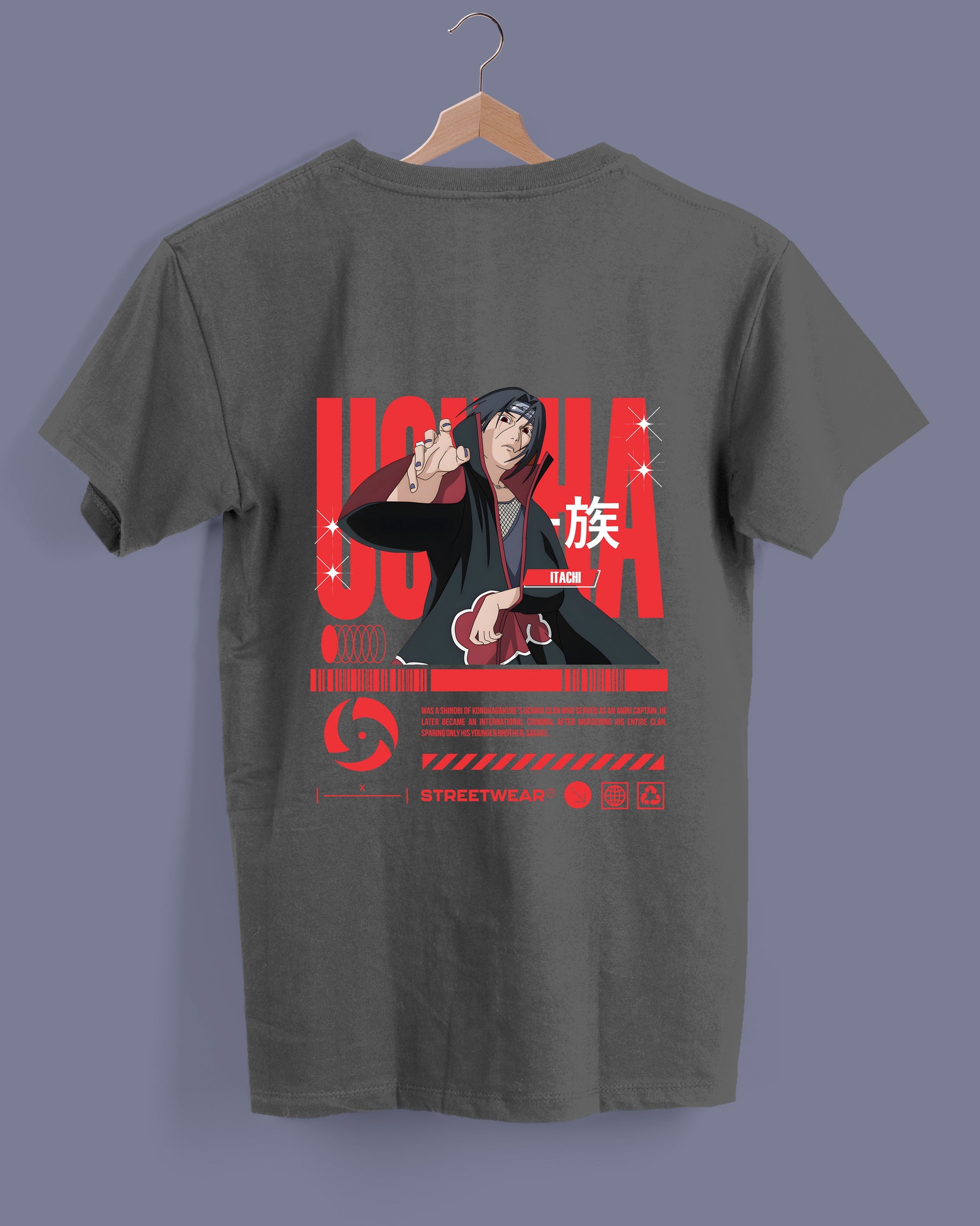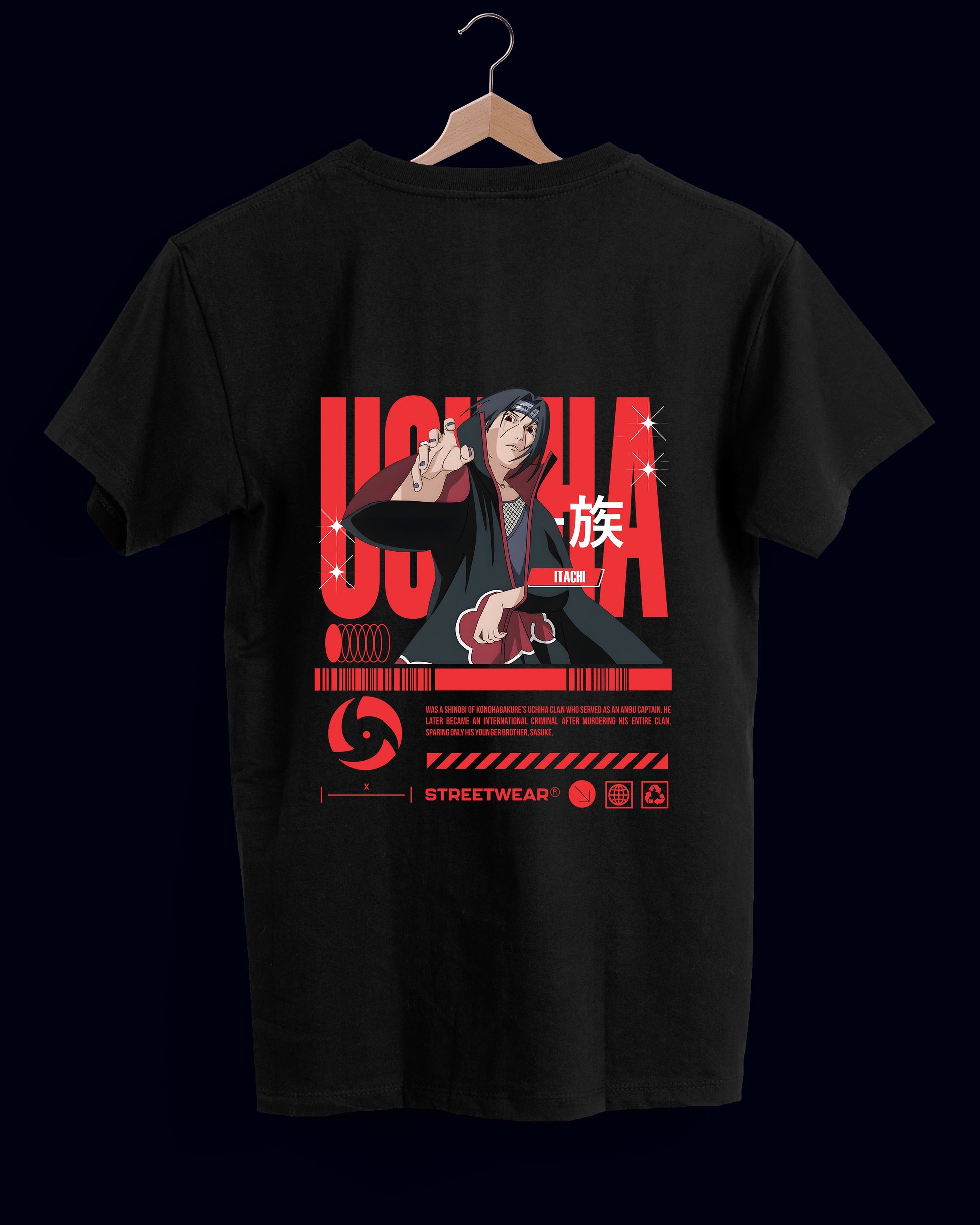 Una explosión de estilo y poder visual. Esta pieza presenta al icónico personaje del clan Uchiha en una pose desafiante, con detalles en rojo y negro que evocan fuerza, misterio y legado. El diseño central combina arte tipo anime con tipografía agresiva en inglés y japonés, destacando el nombre “UCHIHA” en letras naranjas audaces y símbolos reconocibles como el abanico del clan.