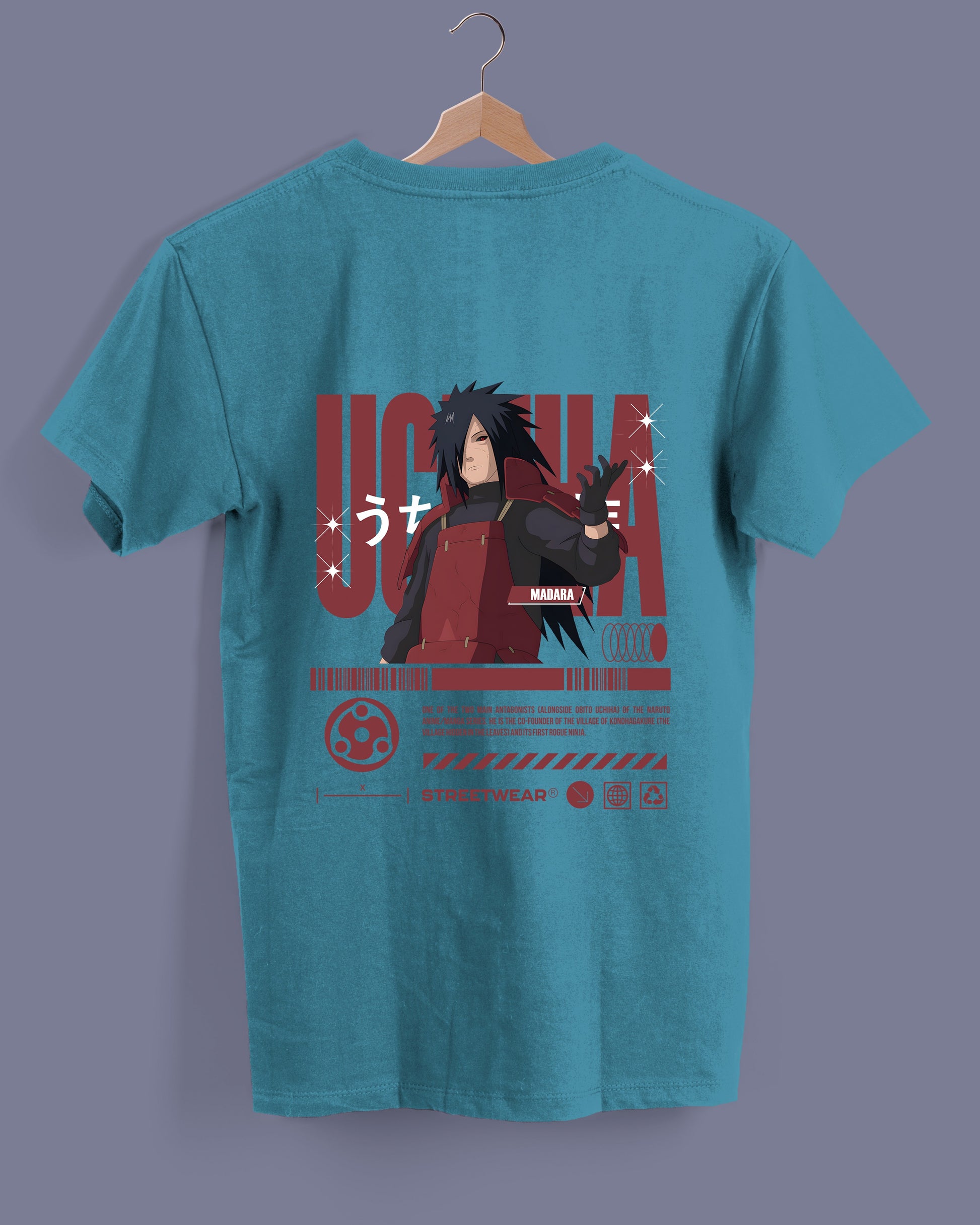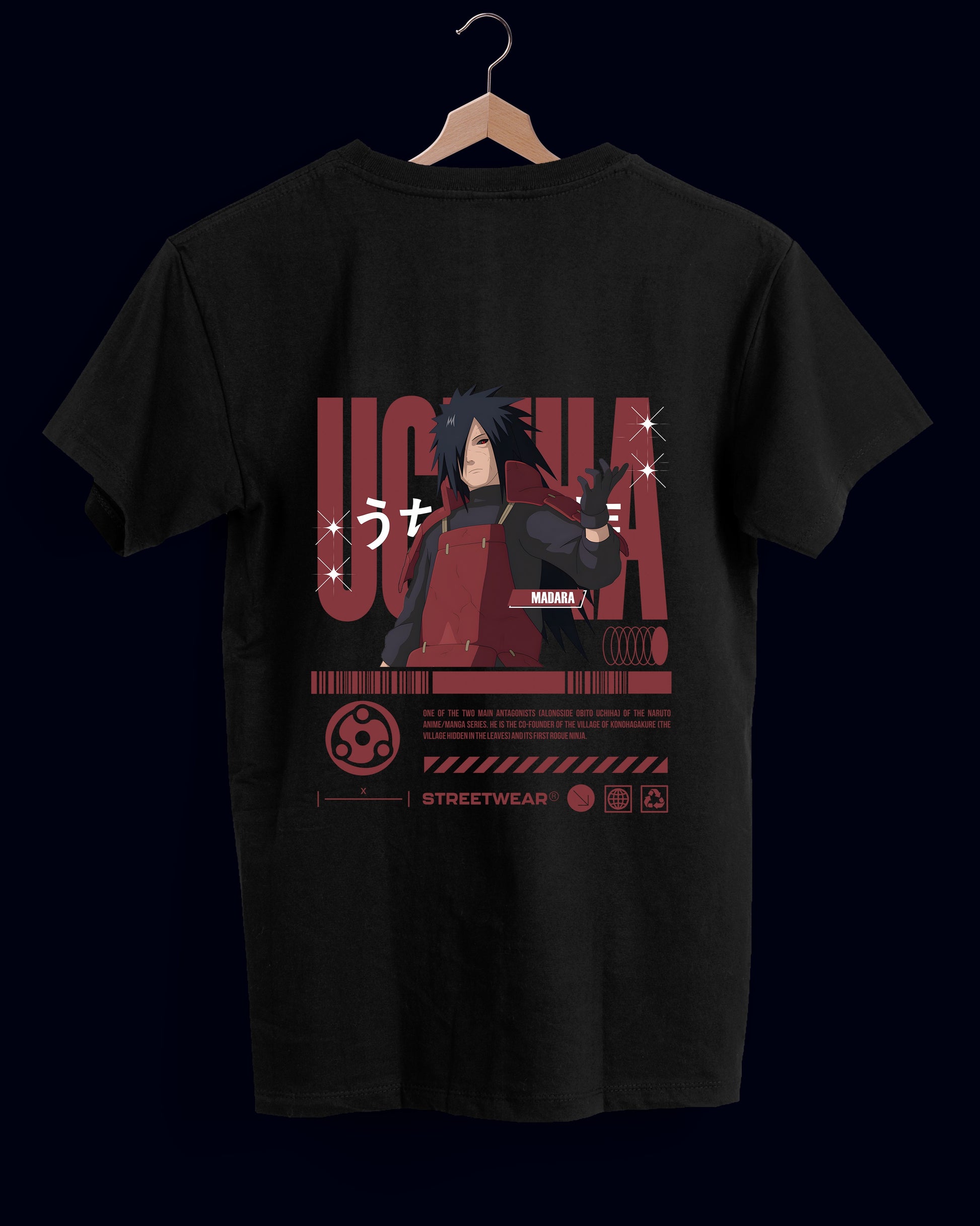 Desata tu poder interior con esta pieza inspirada en uno de los personajes más legendarios del anime: Madara Uchiha. La ilustración trasera muestra al guerrero en su armadura roja, extendiendo su mano como símbolo de dominio y desafío. El diseño se complementa con tipografía japonesa, el nombre “MADARA” en blanco y el imponente “UCHIHA” en rojo vibrante, todo sobre una composición gráfica que fusiona cultura pop y estética streetwear.