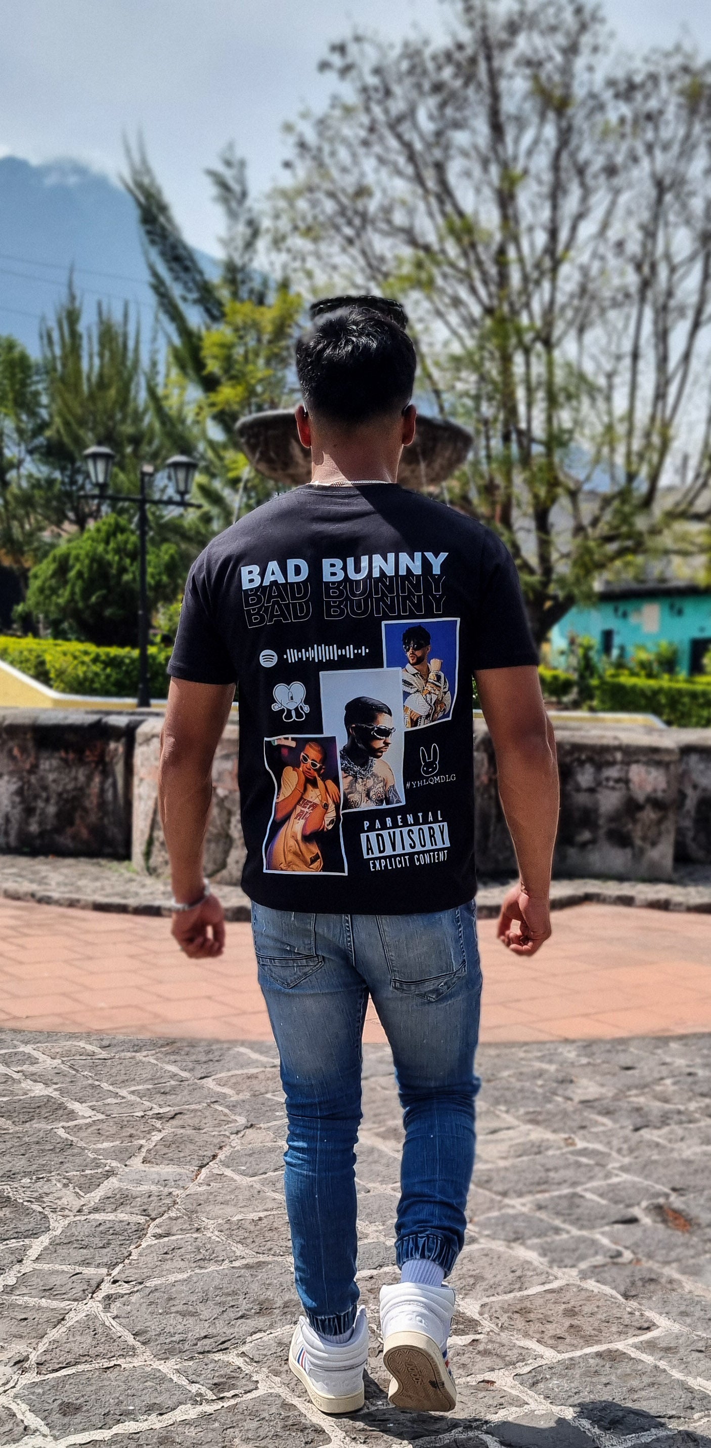 Este diseño celebra la energía cruda y rebelde de Bad Bunny con una composición visual que grita actitud. La camiseta negra presenta tres retratos icónicos del artista, acompañados de gráficos estilo cartoon, un código de Spotify que conecta directo con su música, y el sello “Parental Advisory” como declaración de irreverencia. El hashtag #YHLQDLG corona el diseño, recordando que aquí se hace lo que uno quiere. Es más que una prenda: es una declaración de identidad para quienes viven sin pedir permiso.